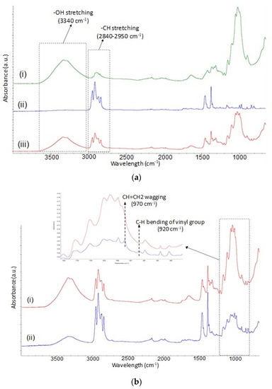 IR spectra of (a) (i) flax fibres, (ii) PP fibres and (iii) commingled Flax/PP woven fabric; and (b) (i) untreated and (ii) VTS-treated Flax/PP fabrics (3 wt-% VTS Sol.).