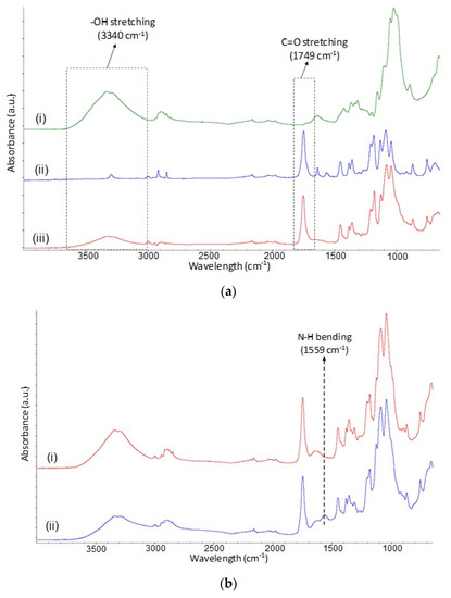 IR spectra of (a) (i) flax fibres, (ii) PLA, and (iii) commingled Flax/PLA woven fabric; and (b) (i) untreated and (ii): APTES-treated Flax/PLA fabrics (3 wt-% APTES Sol.).