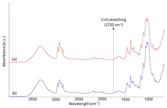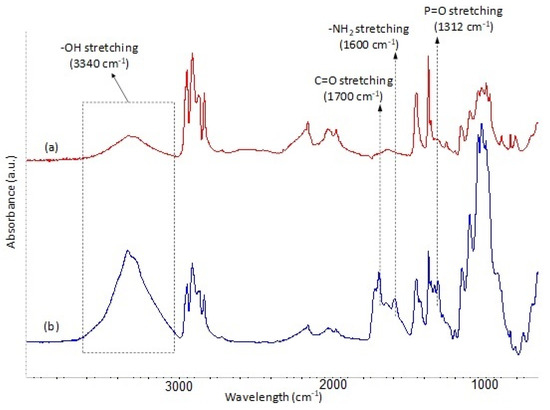 IR spectra of (a) Flax/PP and (b) Pm-Flax/PP (150 W) fabrics.