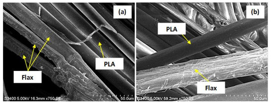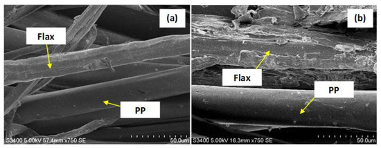 The surface morphologies of untreated and plasma-treated Flax/PP fabrics were also observed by scanning electron microscopy (SEM) and micrographs of the fabrics are given in Figure 6. The SEM image of Flax/PP fabric shows the surfaces of both flax and PP fibres where the latter have smoother surfaces and more uniform diameters in comparison to flax, Figure 6a. After the plasma treatment, the micrographs show obvious changes in the flax fibre surface morphology as can be seen from Figure 6b, which appear rougher than observed in the untreated Flax/PP fabric, while the PP surfaces though ablated, are less affected. This could be explained by the etching mechanism of plasma treatment where the ions produced by the argon plasma flame can bombard and ablate surface regions, especially of the outer layers on the flax fibre bundles [16,35,36]. This suggests that rather than arising from chemical changes on the surface, the improvement in tensile properties of plasma treated Flax/PP in comparison to the untreated one may have a contribution from fibre surface roughening, which increases mechanical interlocking of components within the heat-bonded, flax fibre–polymer matrix [35,36].