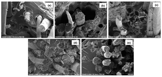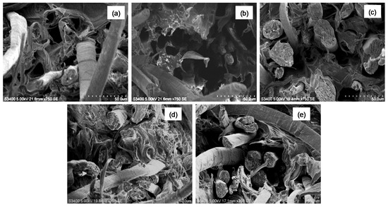 SEM images of the fractured regions of (a) Flax/PP, (b) FR-Flax-PP, (c) FR-Si-Flax/PP, (d) FR-Pm-Flax/PP, and (e) FR-Pm-Si-Flax/PP 8-layered laminates.