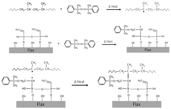 The compatibility between flax and PP of VTS treated Flax/PP is therefore improved, as compared to the untreated one. Moreover, with the addition of dicumyl peroxide (DCP) in the VTS solution, the vinyl groups on VTS treated flax could also chemically react with PP as the DCP could work as an initiator to create free radicals by abstracting hydrogen atoms from the polymer backbone of PP as well as breaking the double bond of the vinyl groups on the surface of VTS-treated flax [25,26,27,28]. These therefore lead to possible chemical bonding between two radicals, and formation of a siloxane bridge between flax and PP as shown in Scheme 3. As a result of the improvement of the compatibility and the formation of siloxane bridge between flax and PP matrix of VTS-treated Flax/PP, the fibre/matrix interfacial adhesion has been enhanced, which has resulted in the increase in tensile properties of the VTS treated Flax/PP laminates, as compared to the control, Table 4.