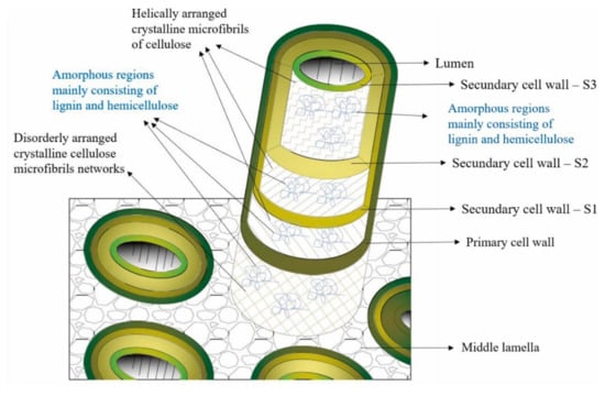 The kenaf fibres are extracted from the plant’s stalk, which is made up of two main parts. The outer part consists of long fibres called the bast fibre that makes up about 35% of the total weight of the plant, and the inner part is the core, which is a woody component with short fibres [16]. Bast fibres have a hollow centre channel or lumen that transports water and nutrients throughout the plant. The cell wall is composed of several layers: the middle lamella, the primary wall and secondary walls, which are divided into three categories: external secondary wall (S1), middle secondary wall (S2), and internal secondary wall (S3). These layers are made up of microfibrils that are orientated in space at specific (angles) depending on the layer. The middle lamella consists of pectin that cements fibres together into a bundle, while the primary cell wall is composed primarily of cellulose fibrils that are disorganized and embedded in a matrix of hemicellulose, lignin, pectin, and proteins. The secondary cell wall, which contains the most cellulose, is composed of three layers of cellulose fibrils with different axial orientations bound by hemicellulose and lignin [22,23,24]. The typical structure of natural fibres is presented in Figure 5.