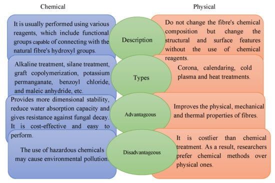 To overcome these weaknesses, surface pre-treatment using chemical or physical modification has been identified as an effective method for reducing the water absorption of these fibres and for enhancing the interfacial adhesion between the fibre surface and the cement matrix [32]. Several chemical and physical modification methods have been discussed in the previous studies, which have accomplished different levels of success in enhancing KF properties and fibre-matrix bonding. Figure 7 displays the description, types, advantages, and disadvantages of these two methods.