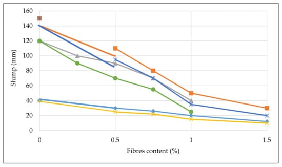 Figure 8 presents the slump height of different KFRCC mixtures [35,36,37]. The addition of fibre significantly decreased the slump of the unreinforced mixture. The degree of loss of workability increased with the volume fraction of the fibres. This reduction is due to the water absorption property of the hydrophilic surface of KF that makes the mixture stiffer and drier when additional fibres are used. Besides, the long fibres (50 mm) reduced the workability more than the short ones (25 mm). Because long fibres hold the mixture up and make it more flow resistant. This may also be attributed to the orientation and contact surface area of KF with the composite.