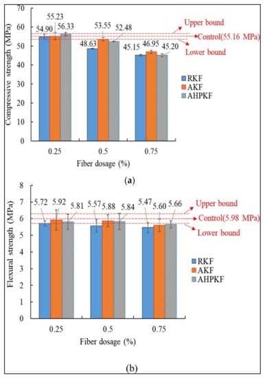 Impact of alkaline treatment method and fibre dosage on mechanical properties of KFRCC: (a) compressive strength and (b) flexural strength. Reprinted from [9] with permission from Elsevier.