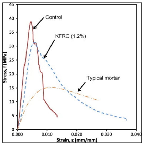 Stress-strain curve of the non-fibrous matrix (control) and KFRCC. Reprinted from [17] with permission from Elsevier.