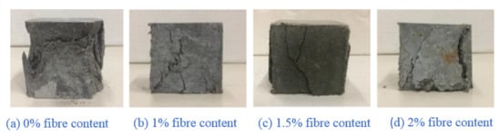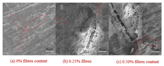 Pirmohammad et al. [13] observed that the fracture toughness increases linearly with fibre content up to 0.3%. This increment is due to the high tensile strength of KF, which increases KFRCC resistance against cracks growth. Zhou et al. [59] reported that KFRCC demonstrated higher ductility by exhibiting less spalling and a slower formation of cracks under compression and flexure loads than the plain composite. As shown in Figure 12, there was a considerable amount of cement matrix and aggregates spalling in the plain sample. On the other hand, the KFRCC specimens had less obvious spalling on the surface. Kenaf fibres can act as bridges across microcracks induced by stress, preventing them from propagating in cementitious composites. Depending on their characteristics and amount, KF hold some of the load in the matrix and transfer the other to the uncracked parts of the specimen, resulting in multiple cracking [64].