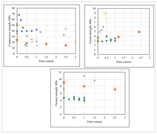 An overview of the mechanical properties of KFRCC is shown in Figure 13 [17,37,58,60,62,65,66]. A reduction of about 10–53% in the compressive strength can be observed with the incorporation of KF. The reduction value increases with increasing the content and length of the fibres. Due to the fibre’s agglomerations and decreased workability that led to entrapped air. However, the reduced compressive strength could be acceptable in most cases if it is still suitable for the proposed application and if other characteristics such as flexural and tensile strengths, as well as shrinking resistance, are improved. Similar strength reduction has been reported by using different types of fibre such as basalt [72], polypropylene [73], and coconut fibres [74].