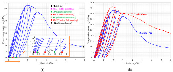 - The FRC cubes exhibited a rather slight increase (<10%) in compressive strength with respect to the PC cubes. A notable influence of the synthetic fibers on the improvement of the post-peak compressive behavior was observed, which indicates the ability of FRC to provide increased ductility.