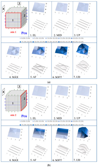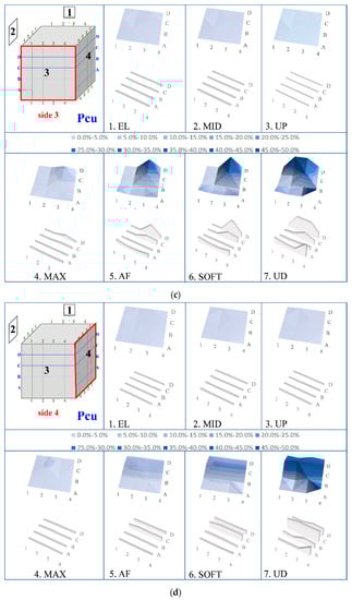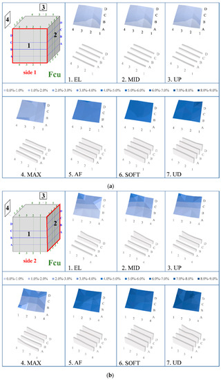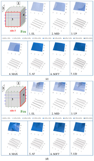 - The illustrated 3D graphs clearly demonstrate that the RMSD index values increased gradually along with the progressive increase in the compressive load and the corresponding damage severity level of the tested cubes. Especially after concrete cracking at post-peak compressive response, the RMSD values of the PC cube were significantly higher than the corresponding RMSD values of the FRC cube. This is justified by the existence of the synthetic fibers, which provided ductile post-peak behavior with respect to the brittle response of the PC cube. This improvement was captured by the RMSD damage index with satisfactory accuracy.