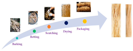 After these steps of barking, wet-retting, scutching and drying, the fibrous material is in a superposition of ribbons whose dimensions (length, width) depend on the debarking. A single ribbon has an average thickness of 100 ± 12 µm. They are made up of highly interlocked bundles of fibers with grid rhombus structured (Figure 2c).