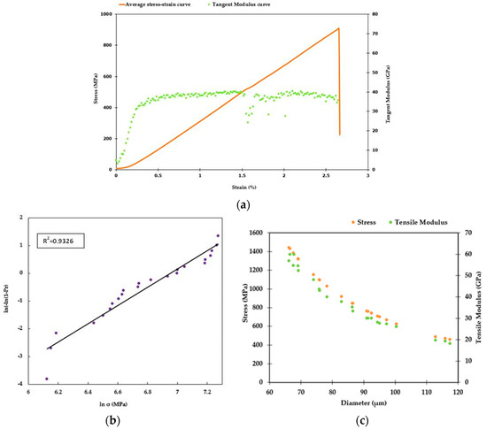 (a) Typical stress–strain curve and evolution of the tangent modulus. (b) Weibull distribution of stress at break. (c) Tensile modulus and stress at the break as a function of diameter measurement.