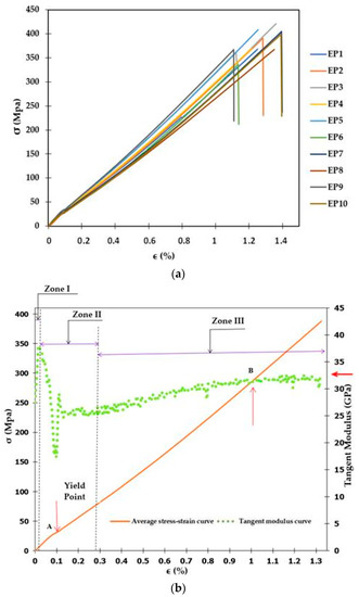 In the first phase, the material behavior is quasi-linear until the yield point, located approximately at 35 MPa and at a strain of 0.11%. After an intermediate zone around this yield point, the second quasi-linear phase shows a reduced slope, thus indicating a lower stiffness of the material. The evolution of the tangent modulus (Figure 5b) function of strain can be classified in three stages: a first increase up to the yield point (between 0 and 0.11% of strain), followed by a significant decrease in the tangent modulus. In the third zone, up to failure, the tangent modulus increases slowly to reach a constant value. A related outcome was reported in the literature in a study of biocomposites reinforced with hemp fibers [24].
