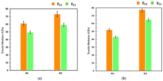 Figure 6 shows the CL fibers’ tensile modulus back-calculated from the tensile results obtained on IFBT samples. These properties are computed with the two different models taking into account (denoted M2, Equation (3)) or not (denoted M1, Equation (1)) the porosities level on IFBT samples (Table 3) and for hackled CL fibers (Figure 6a) and non-hackled CL fibers (Figure 6b).