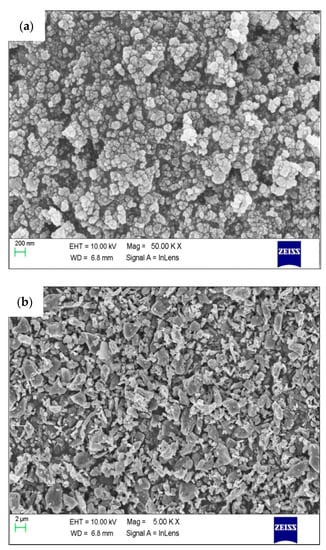 A 2-mm-thick commercial AA5083 aluminum alloy in an initial temper condition of H116 was used as the base metal. The chemical composition of the base metal (%) was 4.0–4.5 Mg, 1.2 Si, 0.4–1.0 Mn, 0.4 Fe, 0.4 Si, 0.25 Zn, 0.15 Cr, 0.1 Cu, and 0.05–0.25 Cr, with the remainder comprised of Al. The base material was sized to 100 mm × 35 mm by using wire-cut electrical discharge machining (EDM). The SiC particles, with mean sizes of 2 µm and 50 nm, were purchased from HONGWU International Group LTD (Guangzhou, China) and used as reinforcements in the friction-stirred area. Figure 1 shows the FESEM of the received particles.