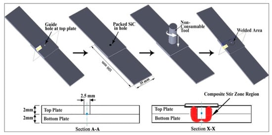 AA5083-H116 is a non-heat-treatable Al-Mg alloy. It finds applications in automobile/aircraft structures, pressure vessels, gas/oil piping, and cryogenics due to its excellent correction and moderate strength []. The excellent mechanical and tribological properties of aluminum-based metal matrix composites make them a better replacement for commercially used aluminum alloy [,]. AA5083 contains 4% to 4.5% of Mg that can be subjected to stress corrosion cracking if it is exposed to service temperatures for long periods of time []. Achieving high-quality welds using Al-Mg alloys via the conventional spot-welding process and fusion welding is risky because of the high heat energy input and vaporization of the alloying elements [].