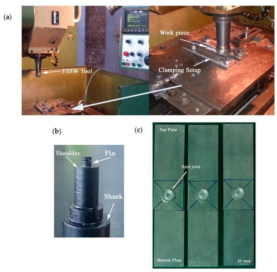 (a) FSSW setup. (b) FSSW tool used for the experiments. (c) Fabricated spot-weld joints.
