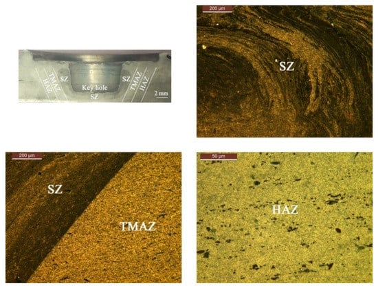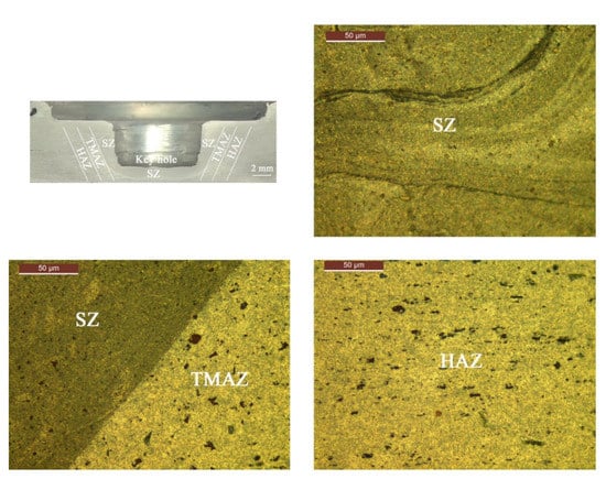 Optical micrographic views showing the various zones (SZ, TMAZ, and HAZ) of the AA5083/micro-SiC joints.