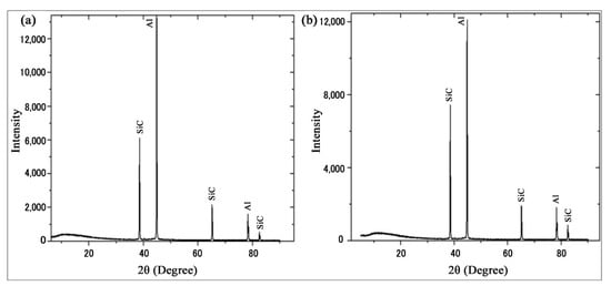 XRD pattern of FSSW joints: (a) AA5083/nano-SiC, and (b) AA5083/micro-SiC.