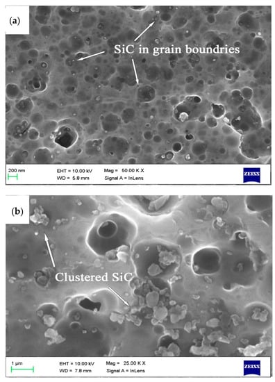Figure 8 shows the FESEM micrographs in center of the SZs of both of the joint types. Within the SZs, the reinforced particles were distributed quite homogeneously. The nano-SiC-reinforced FSSW joints showed the finest particle distribution at the SZ compared to that of the micro-SiC-reinforced FSSW joints (Figure 8a). The SZ of the nano-SiC-reinforced FSSW joints had a homogeneous distribution of the particles and moderately dispersed particle regions. However, the micro-SiC-reinforced FSSW joints had agglomerations of particles, regions with moderately dispersed particles, and particle-free regions, as shown in Figure 8b. Due to fragmentation occurring in the SZs, many clusters could be broken up into small particles and agglomerated, and some clusters could be distributed uniformly in the SZs due to the severe plastic deformation that occurred during the FSSW [].