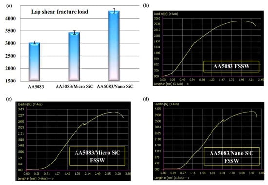 Figure 9a shows the lap shear fracture load of an AA5083 sample (with no filler), an AA5083/micro-SiC joint, and an AA5083/nano-SiC FSSW joint, while Figure 9b–d depicts their corresponding load-displacement curves. The lap shear fracture loads of the AA5083/micro-SiC and AA5083/nano-SiC FSSW joints were 3440 N and 4298 N, respectively, while that of the AA5083 sample (with no filler) was 3023 N. It is evident that the incorporation of SiC enhanced the lap shear strength of the joints, and in particular, the nano-SiC particles gave rise to a 29.6% higher strength. Particle agglomeration in the SZs may have been the reason for the lower lap shear strength in the micro-SiC-added joints. The nano-SiC-added joints had the highest lap shear strength because of the uniformly dispersed nanoparticles in the welded areas caused by the friction stir process. Adding to this, the decrease in grain size may have strengthened the grain boundaries and prevented grain growth at the grain boundaries [,]. This is evidenced in Figure 8a.