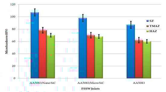The uniformly dispersed fine SiC particles (both the nano- and micro-SiC) in the processed zones provided more nucleation sites for the re-precipitation of new grains and more precipitates in the aluminum matrix. The AA5083/nano-SiC samples showed the highest microhardness values (107 ± 2 HV) compared to the AA5083/micro-SiC samples (94.7 ± 2 HV). The increase in the SZ's microhardness compared to that of the other zones was due to the grain size reduction in this region (Hall–Petch relation) [,]. The nano-sized particles led to the formation of grain growth, which minimized the microhardness values in the SZs. Further, we perceived that the addition of the SiC particles did not significantly influence the TMAZs and the HAZs.