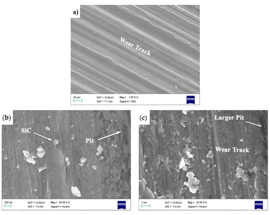 Figure 12 shows the FESEM images of the worn surfaces of the FSSW samples. The morphologies of the test surfaces show significant differences among the samples. The samples without the addition of SiC exhibited severe plastic deformation and surface layer removal compared to the SiC-added joints. Among all the welded samples, the nano-SiC-added sample underwent the least wear and showed shallow pits, as evidenced in Figure 12b. The presence of agglomerated micro-SiC particles was the reason for the higher number of pits in the micro-SiC-added joints, as evidenced in Figure 12c.