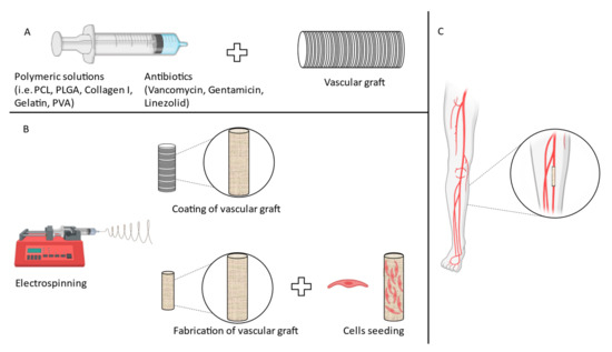 Nanofibers are an example of nanomaterials that are typically produced by the electrospinning technique. Electrospinning is a simple and cost-effective method that enables control over the fiber diameter and allows formation of fibers composed of a selected polymeric solution [54]. Briefly, the polymer solution is squeezed from a syringe into a drop in a high electrostatic field; this process allows for the formation of a jet, and while the solvent evaporates, the nano-sized fibers form (Figure 1). Nanofibers can be obtained from a wide range of both natural and synthetic polymers, according to the specific application [54,64,65,66]. Porosity as well as alignment of the nanofibers can be controlled with unprecedented detail [67]. Due to their nanometric dimensions, it is possible to exploit a greater surface area compared to bulk materials, allowing enhanced adhesion of cells or surface engrafting of proteins and drugs [68,69]. Moreover, mechanical properties of the nanofibrous constructs can be customized to a great extent, tuning key features such as flexibility and stiffness. Studies have investigated the feasibility of electrospinning as an innovative technique to generate nanofibrous constructs or coatings for premade grafts. Different approaches have been utilized, ranging from the fabrication of a de novo VG with materials that possess antimicrobial properties to the coating of premade grafts with nanofibrous coating of antibiotic (Figure 1).