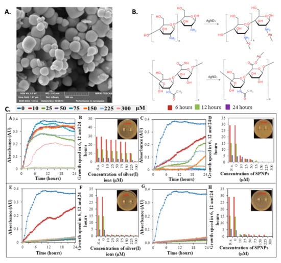 Metal nanoparticles with antiseptic polymers (A) SEM image of silver phosphate nanoparticles. (B) Suggested structures of silver complexes. (C) Growth curves (subpanels (A,C,E,G)) as well as growth rate and inhibition zones (B,D,F,H) of S. aureus after application of (A,B) hyaluronic acid with AgNO3, (C,D) hyaluronic acid with silver phosphate nanoparticles (SPNP), (E,F) chitosan with AgNO3, and (G,H) chitosan with SPNP. Reprinted with permission from ref. [102]. Copyright 2013 MDPI.
