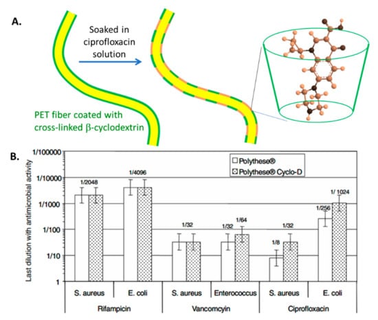 Use of cyclodextrin polymer to encapsulate antibiotics. (A) Schematic of polyester prostheses coated with a cyclodextrin polymer and activated with ciprofloxacin. (B) Antimicrobial activity of polyester prostheses activated with antibiotics, with and without cyclodextrin. Reprinted with permission from [103] Copyright 2008.