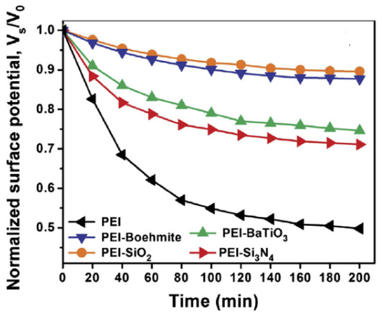- Gao, H.; He, W.; Zhao, Y.B.; Opris, D.M.; Xu, G.; Wang, J. Electret mechanisms and kinetics of electrospun nanofiber membranes and lifetime in filtration applications in comparison with corona-charged membranes. J. Memb. Sci. 2020, 600, 117879. [Google Scholar] [CrossRef]