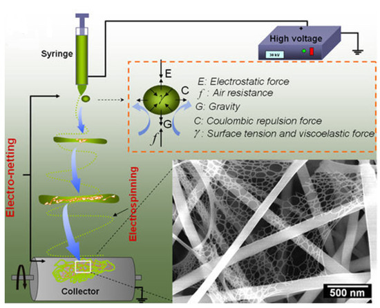 - Wang, X.; Ding, B.; Sun, G.; Wang, M.; Yu, J. Electro-spinning/netting: A strategy for the fabrication of three-dimensional polymer nano-fiber/nets. Prog. Mater. Sci. 2013, 58, 1173–1243. [Google Scholar] [CrossRef] [PubMed]