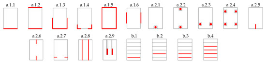 Figure 1 shows strengthening layouts examples. Configurations marked with a.1 correspond to the external reinforcement, whereas a.2 to the internal reinforcement. Layouts “b” present the reinforcement techniques used at the stage of production [7].