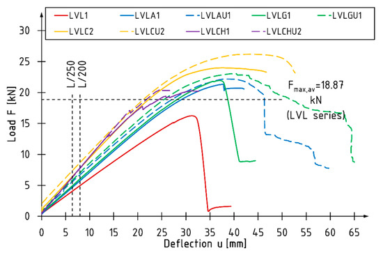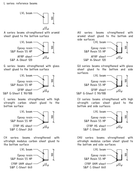 - LVLAU series—beams strengthened with 14.5 cm wide aramid sheet glued to the bottom and side surfaces (reinforcement ratio, ρt = 0.64%);
