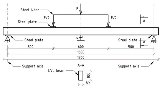 A common method of strengthening bending members to increase load bearing capacity, stiffness and ductility parameters is the incorporation of additional elements to strengthen the existing beam. Several reinforcement layouts have been tested in 3- and 4-point bending tests. Reinforcement inserts can take the form of sheets [2,3], bars [4,5,6], laminates, plates or other structural shapes (T-sections, C-sections, I-sections, etc.) connected to the reinforced element by means of mechanical fasteners or structural adhesives. The reinforcement can be placed outside or inside the cross-section, in the tension and/or compression zone of the beam. Elements made of solid timber, glued laminated timber or engineering wood products can be strengthened. Conventional reinforcement of such elements is made of steel or aluminum. Composite materials are currently gaining popularity though. In addition to design requirements, the choice of reinforcement measurements is also constrained by other factors such as aesthetic aspects, cost, access to the reinforced element or fire protection requirements.