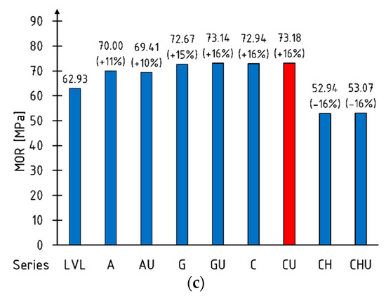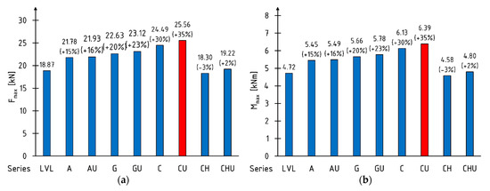 Figure 5 shows the average values of the maximum bending moment, loading force and modulus of rupture. The percentages of the increment in relation to the reference beams are shown in brackets. Extreme (maximum) values are marked with red fill pattern.