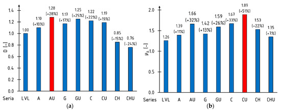 The yield point of the elements was determined according to the guidelines given in the study [66]. The maximum deflection value was taken at the point of significant load drop. The energy was determined by integrating fifth-degree polynomials from the beginning of the test to the characteristic point. Figure 7 shows the average values of ductility indices. Extreme (maximum) values are marked with red fill pattern.