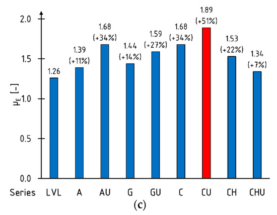 Nadir et al. [43] achieved a 44.37% and 46.36% increase in the ductility index µE for glued laminated timber beams reinforced with one and two layers of GFRP sheet, for which the degree of reinforcement in the tension zone was 2.5% and 5%. Slightly higher values were observed when using CFRP sheets. The tests were carried out on elements on a laboratory scale.