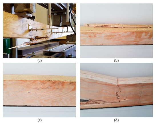 - Failure of timber in compression zone (kink-bands), with no rupture of composite reinforcement (Figure 9f)—typical failure for beams strengthened with GFRP sheets in U-configuration;