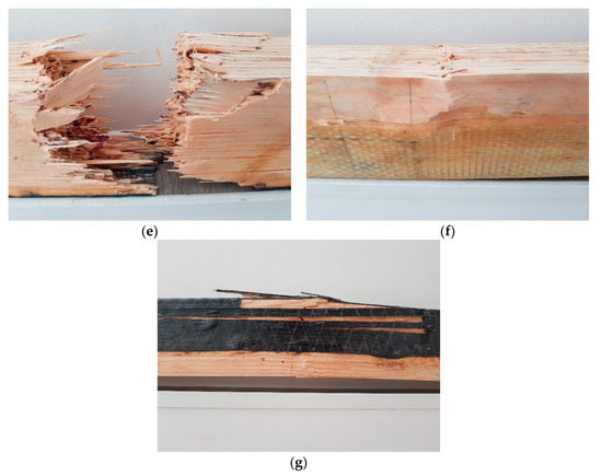 - Failure of timber in compression zone (kink-bands), with rupture of composite reinforcement (Figure 9g)—typical failure for beams strengthened with AFRP and CFRP sheets in U-configuration.