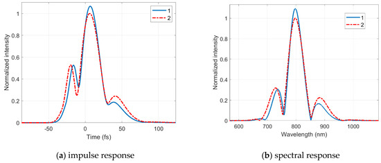The form of the response time characteristic obtained due to modeling, according to the proposed algorithm (Figure 6a), is practically identical to that of the experimental curve. It has the shape of a glove with three distinct peaks. The time delay between the main peaks of the experimental curve is 33.5 fs (Figure 6a). On the other hand, the time delay between the main peaks of the theoretical curve is 36.0 fs (Figure 6a). Therefore, the differences in the estimates of the time intervals between the maximum values of the glove peaks, determined by the theoretical and experimental characteristics, do not exceed 8%. The spectrum width at the level of 0.5 for the experimental characteristic is 143.8 nm (Figure 6b). On the other hand, the spectrum width at the level of 0.5 for the theoretical curve is 159.4 nm (Figure 6b). Thus, the difference in the estimates of the spectral width obtained experimentally, and modeled using the algorithm proposed in this work, is no more than 11%.