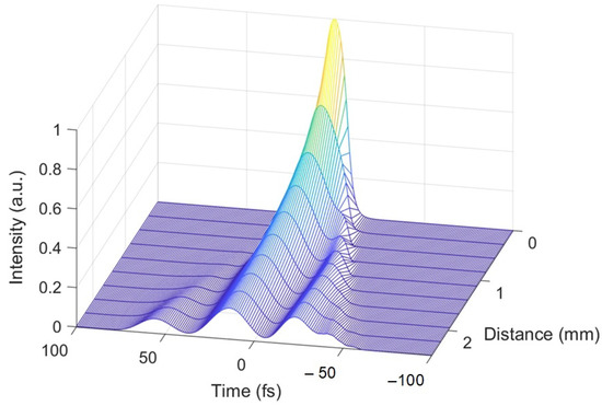 We simulated the evolution of a high-power femtosecond pulse during propagation in a polarization-maintaining optical fiber for the above experimental conditions. We simulated the pulse propagation process by solving the system of Equation (4) according to the proposed algorithm of SSFM. For example, Figure 4 shows the simulation results for uniform excitation conditions at the input and the delay between orthogonally polarized modes equal to 6 ps/m.
