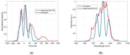 To test the solution under consideration, which describes the propagation of a high-power ultrashort pulse in polarization-maintaining optical fiber, we performed the simulation for the experimental conditions described in detail [60,61,62,63,64,65,66]. According to the experiment’s description, a Ti: sapphire femtosecond laser with a mode-locking and a center wavelength of 798 nm generated pulses with a duration of 12 fs and a peak power of 175 kW. Optical radiation at the laser output is separated using an optical splitter. The one part of the optical power from the mirror to feed to the spectrometer or the fringe-resolved autocorrelator. The other part is introduced into an optical fiber using an objective with a reflector. As noted in [60,61,62,63,64,65,66], the use of such lenses excluded additional chromatic dispersion. At the output of the optical fiber, optical pulses are output using the same objective. The spectrometer evaluates the optical signal’s spectral characteristic at the input and output of the optical fiber. The impulse response was measured using the fringe-resolved autocorrelator. The experimental time and spectral characteristics of optical pulses from Refs [60,61,62,63,64,65,66] are presented below, together with the simulation results.