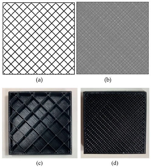 Schematic representation of the layups used for printing PLA and PF samples at an infill of (a) 10% and (b) 30% and related rendering for 3D printed PLA samples with a scale of 0.3 (45 × 45 × 9 mm) with (c) PLA-10% and (d) PLA-30% infill.