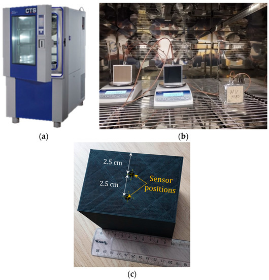 Hygrothermal behaviour analysis using climatic chamber: (a) Overview of the climatic chamber, (b) samples inside the climatic chamber (PF-10% infill on the left, PLA-10% infill in the middle, and hemp concrete on the right), and (c) a zoomed view on a sample printed using an infill of 10% and a printing temperature of 200 °C with sensor positions.