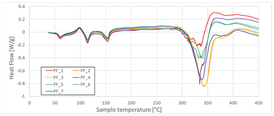 Heat flow (HF) of seven as-received samples of PLA-Flax (PF) filaments taken from different spools.