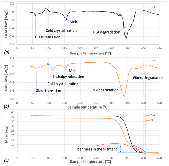 Heat flow (HF) of as-received PLA (a), PF (b), and mass loss (c) of PLA and PF filaments during DSC/TGA tests.