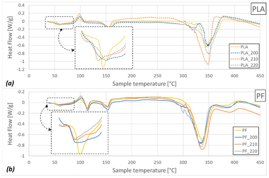Heat flow (HF) of (a) PLA and (b) PF for different printing temperatures (200 °C, 210 °C, and 220 °C).
