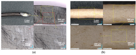 Surface state of the as-received filaments observed by digital microscopy: (a) PLA and (b) PF.